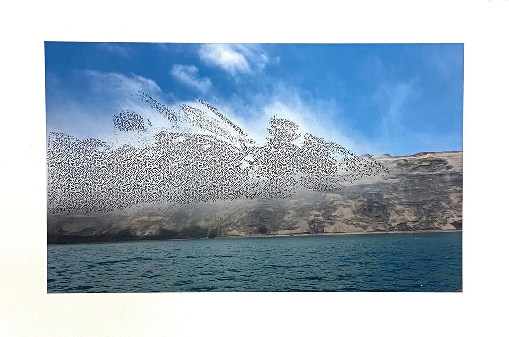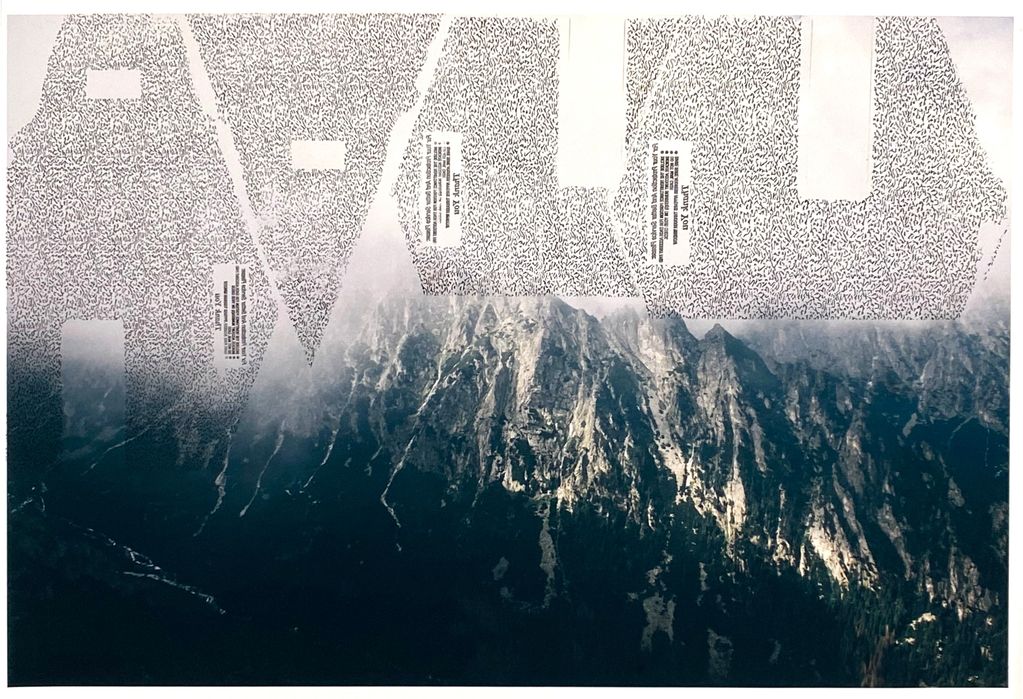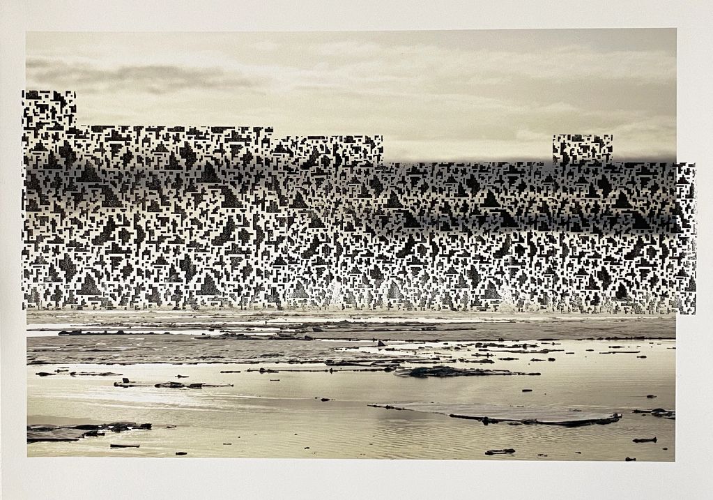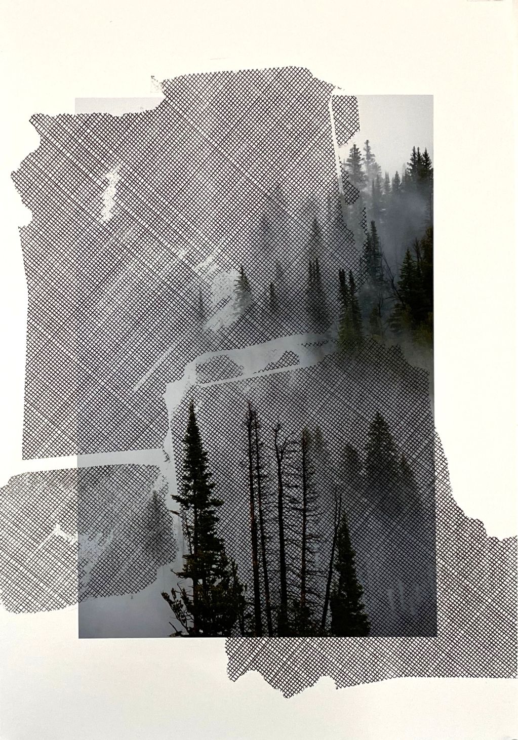 Isolation Landscapes, along with the video series Secure World View, inserts the security patterns found on the inside of envelope into the natural world to delineate a boundary. This line of demarcation can be thought of as a wall, an invisible fence made visible by a surge of energy. The patterns coalesce on water vapor and exist at a distance ahead of the viewer in the landscape that signifies a point where beyond that, they can not consume the world. It is the perception of the viewer as to weather this is security or it is limitation. Made during the pandemic, they are also a response to the contraction of my own movements as someone living with an autoimmune disease and on treatments that make me more susceptible to Covid-19.